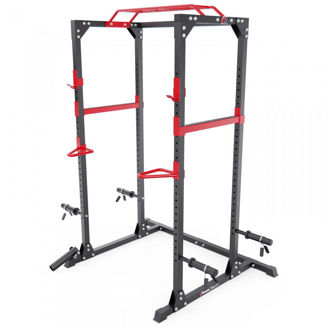 Рама выполнена из прочного стального профиля 50 х 50 х 1,5 мм, что обеспечивает надёжность и устойчивость конструкции. Посадочный диаметр — 50 мм, а количество посадочных мест — 4, что позволяет комфортно размещать и хранить диски + пружинные зажимы в комплекте. Максимальная нагрузка на держатель штанги и страховочную трубу составляет 100 кг, а на грузовую трубу — 50 кг, позволяя постепенно увеличивать рабочие веса.