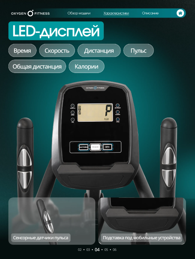OXYGEN FITNESS ALAMOSA — надёжный эллиптический тренажёр для домашних тренировок, ориентированный на пользователей, которым важны плавность хода, сбалансированная нагрузка и комфорт суставов. Передний привод, продуманная эргономика и магнитная система нагружения делают ALAMOSA отличным выбором для регулярных кардиотренировок, направленных на развитие выносливости и укрепление всего тела. Тренажёр построен на высокопрочной раме с антикоррозийной обработкой и двухслойной покраской, что обеспечивает устойчивость и долговечность конструкции. Корпус выполнен из ударопрочного полистирола HIPS, устойчивого к износу. Передний привод и инерционный вес маховика 24 кг (BioFusion™) обеспечивают ровное, стабильное и естественное движение без рывков. Реальный вес маховика составляет 6 кг. Длина шага 460 мм подходит для большинства пользователей и позволяет поддерживать комфортную амплитуду движения. Расстояние между педалями — всего 80 мм, что снижает нагрузку на колени и тазобедренные суставы. Педальный узел с трёхкомпонентным шатуном повышает надёжность и ресурс тренажёра, а увеличенные антискользящие педали обеспечивают уверенную фиксацию стопы. ALAMOSA использует магнитную систему нагружения с 10 уровнями сопротивления, регулируемыми механически. Это позволяет легко подобрать интенсивность тренировки — от лёгкой кардионагрузки до более энергичных занятий. Тренажёр не требует подключения к электросети, что упрощает установку и эксплуатацию в домашних условиях. Консоль оснащена монохромным LED-дисплеем и отображает основные параметры тренировки: • время, • скорость, • дистанция, • калории, • пульс, • общую дистанцию. Доступные режимы: быстрый старт и ручной режим. Интерфейс поддерживает русский и английский языки. Для контроля сердечного ритма предусмотрены сенсорные датчики пульса на поручнях. Рукоятки двухпозиционные, с нескользящим покрытием. OXYGEN FITNESS ALAMOSA - сбалансированный эллиптический тренажёр для домашних тренировок, сочетающий плавность хода, надёжную конструкцию и комфортную биомеханику для ежедневной работы над выносливостью и формой.