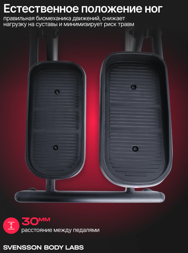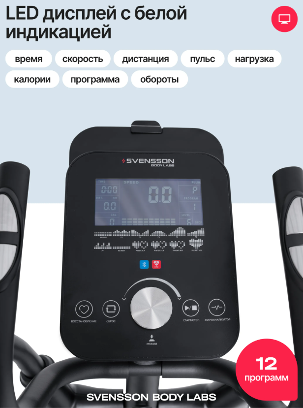 Эллиптический тренажер SVENSSON BODY LABS FORGE — это идеальный выбор для тех, кто хочет заниматься фитнесом дома. С весом 52 кг и высокопрочной рамой с антикоррозийной обработкой, этот тренажер обеспечивает устойчивость и долговечность. Он оснащен электромагнитной системой нагружения с 16 уровнями нагрузки, что позволяет вам адаптировать тренировки под свои физические возможности и цели. Тренажер предлагает инерционный вес маховика в 24 кг, что обеспечивает плавный и комфортный ход. Расстояние между педалями составляет всего 30 мм, что способствует естественному движению во время тренировки. Длина шага в 500 мм и антискользящие педали увеличенного размера гарантируют безопасные и эффективные занятия. Двухпозиционные нескользящие рукоятки с сенсорными датчиками пульса позволяют контролировать сердечный ритм во время тренировки. Интуитивно понятная консоль и разнообразие программ Консоль с LED-дисплеем белой индикации отображает время, скорость, дистанцию, пульс, уровень нагрузки, калории и обороты. С 12 программами тренировок, включая ручной режим, предустановленные и пульсозависимые, вы сможете разнообразить свои занятия. Возможность подключения к тренировочным мобильным приложениям (Kinomap™, Fitshow™) через Bluetooth добавляет элемент интерактивности и мотивации. SVENSSON BODY LABS FORGE сделает ваш домашний фитнес не только более доступным, но и эффективным! Ключевые преимущества SVENSSON BODY LABS FORGE: • 16 уровней нагрузки для индивидуальной настройки тренировок, подходящие для пользователей до 150 кг; • сенсорные датчики на поручнях для точного измерения пульса и возможность сопряжения с кардиодатчиком Bluetooth; • транспортировочные ролики и компенсаторы неровностей пола для легкости перемещения и установки; • подставка для планшета/смартфона и держатель для бутылки для максимального удобства во время тренировок.
