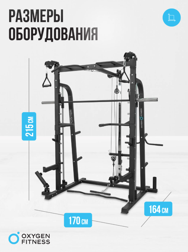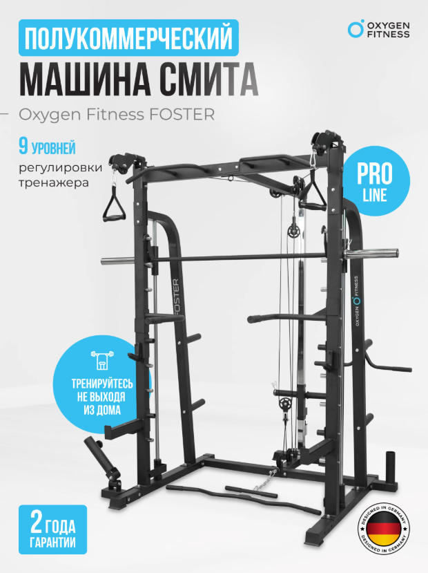 Машина Смита OXYGEN FITNESS FOSTER — это идеальное решение для тех, кто ищет качественное полукоммерческое силовое оборудование на свободных весах. Созданная с учетом современных требований фитнес-индустрии, этот тренажер позволяет эффективно тренировать различные группы мышц, обеспечивая надежность и безопасность во время занятий. С весом нетто 128 кг, машина обладает прочной конструкцией, которая гарантирует стабильность во время выполнения упражнений. Гриф, длиной 197 см с диаметром 50 мм, обеспечивает удобство и комфорт при тренировках. Устройство оснащено 9 уровнями регулировки, что позволяет легко адаптировать его под индивидуальные потребности пользователя. Машина Смита OXYGEN FITNESS FOSTER позволяет выполнять широкий спектр упражнений, нацеленных на развитие различных групп мышц. Благодаря наличию 2 стаканов для грифа и 4 пружинных замков, вы сможете быстро и безопасно менять веса, что делает тренировки еще более эффективными. С помощью стального троса диаметром 5 мм, вы получите надежную и долговечную систему нагрузки. Машина Смита OXYGEN FITNESS FOSTER — это ваш надежный партнер на пути к достижению поставленных фитнес-целей! Ключевые преимущества OXYGEN FITNESS FOSTER: • полукоммерческое назначение, подходит как для домашних тренировок, так и для небольших фитнес-залов; • надежность и качество: прочные стальные тросы и высококачественные материалы; • широкие возможности для тренировки разных групп мышц с использованием свободных весов;
