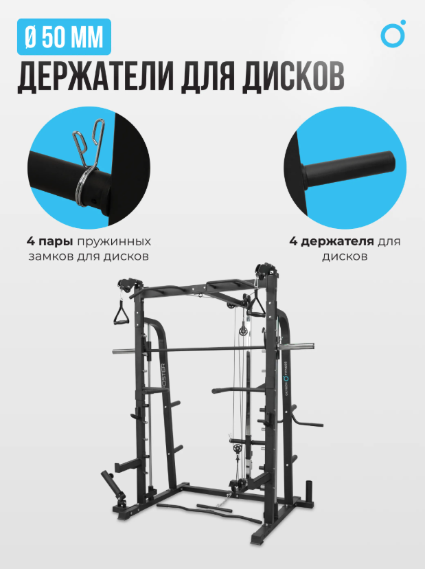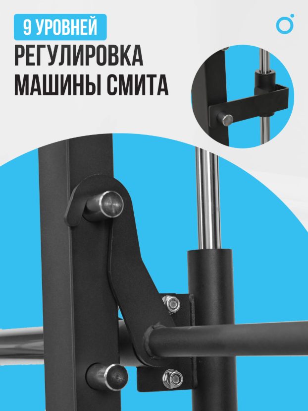 Гриф - 197 см, ф50, 14 кг, 9 уровней регулировки по высоте, стакан для хранения грифа, 4 пружинных замка для грифа. Силовая рама. Машина Смита. Многопозиционный турник. Многопозиционные брусья. Двойная тяга. Гребная тяга. Шарнирный крепеж грифа. |