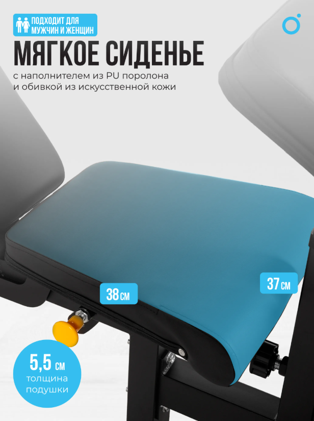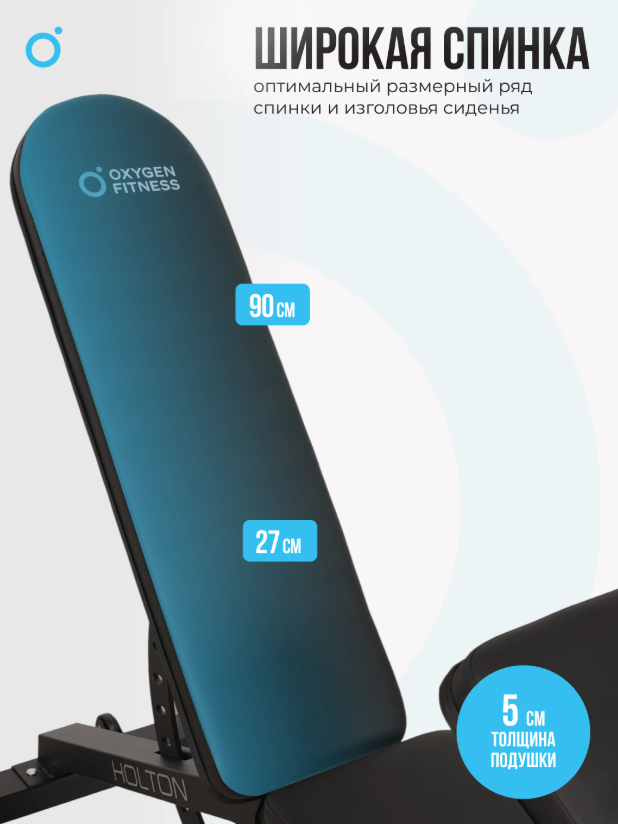 Силовая скамья OXYGEN FITNESS HOLTON — это идеальный тренажер, который позволяет нагружать основные группы мышц: руки, грудь, плечи, торс и ноги. Компактные размеры в рабочем состоянии (длина 206 см, ширина 51 см, высота 129 см) делают ее удобной для размещения в любом помещении. Прочная рама с толщиной профиля 2 мм обеспечивает надежность и стабильность во время тренировок. Скамья предназначена для выполнения разнообразных упражнений, включая жим лежа, разгибание ног, тренировки на бицепс и многое другое. Эргономичное сиденье с наполнителем из PU поролона и обивкой из искусственной кожи обеспечивает комфорт во время занятий. Возможность регулировки положения сиденья и спинки (14 уровней для спинки и 3 уровня для сиденья) позволяет адаптировать скамью под индивидуальные параметры пользователя, что делает тренировки более эффективными. Силовая скамья OXYGEN FITNESS HOLTON оснащена всеми необходимыми элементами для полноценной тренировки. В комплекте имеется штырь для дисков диаметром 50 мм и замок для дисков, что обеспечивает надежную фиксацию веса. Бицепс-рукоятка и 4 неопреновых валика добавляют дополнительные возможности для тренировки и повышают комфорт. Также скамья оснащена транспортировочными роликами, что облегчает перемещение и хранение. Силовая скамья OXYGEN FITNESS HOLTON — это отличный выбор для тех, кто хочет эффективно тренироваться, сочетая комфорт, функциональность и надежность в одном. Ключевые преимущества OXYGEN FITNESS HOLTON: • многофункциональность: возможность тренировки различных групп мышц, включая руки, грудь, плечи и ноги; • комфорт и поддержка: эргономичное сиденье и многоуровневая регулировка обеспечивают удобство и поддержку во время тренировок; • надежная конструкция: прочный профиль рамы обеспечивает долговечность и стабильность скамьи.