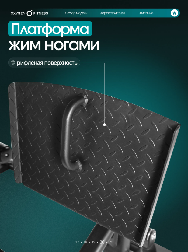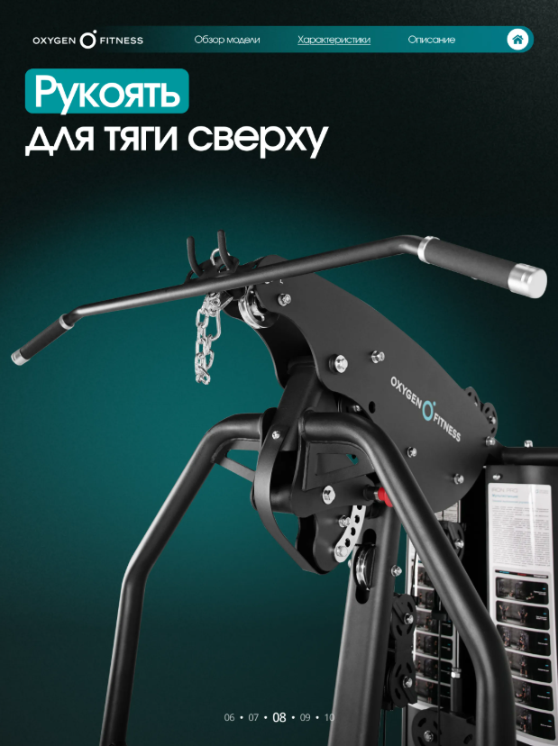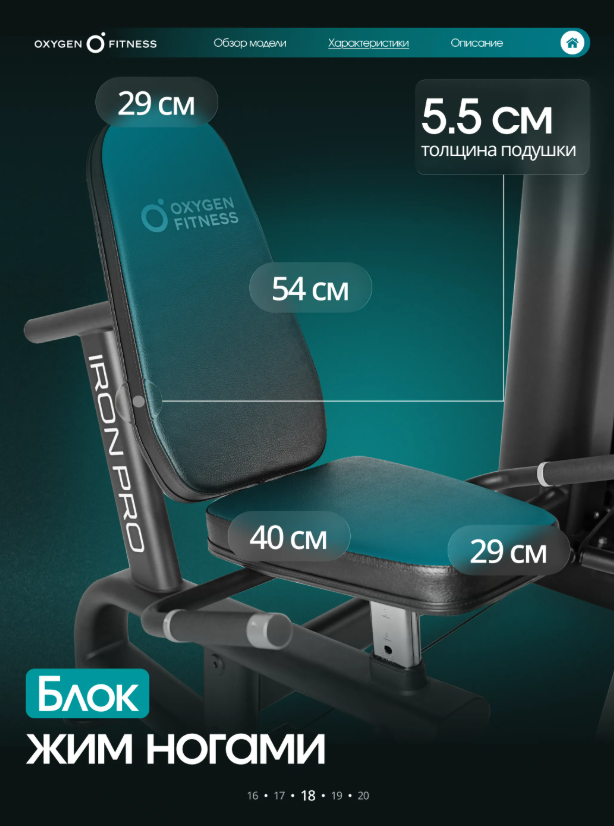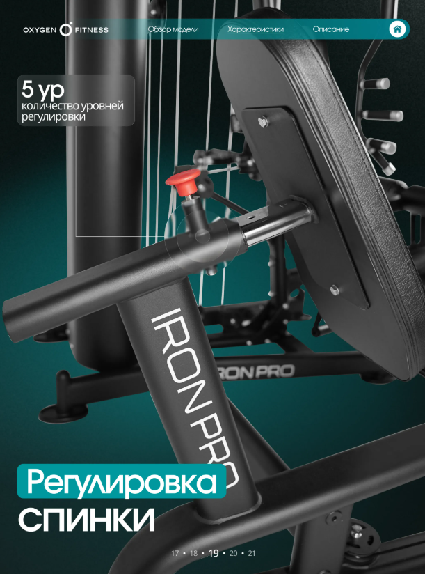 OXYGEN FITNESS IRON PRO — мощная многофункциональная силовая станция полукоммерческого уровня, разработанная для интенсивных тренировок и максимальной эффективности. Модель объединяет широкий спектр силовых упражнений и позволяет полноценно прорабатывать основные группы мышц: грудь, спину, плечи, руки и ноги. Благодаря расширенному функционалу и высокой надежности станция отлично подходит как для домашнего использования, так и для фитнес-студий, корпоративных залов и небольших спортивных клубов. Усиленная конструкция для интенсивных тренировок Основу тренажера составляет прочная стальная рама из профиля 50 × 70 мм с толщиной стенки 2 мм, обеспечивающая высокую жесткость и устойчивость при любых нагрузках. Значительный вес конструкции 327 кг гарантирует стабильность тренажера даже при выполнении динамичных силовых упражнений. Мультистанция рассчитана на пользователей весом до 150 кг, что делает ее надежным оборудованием для регулярных и интенсивных тренировок. Эффективная грузоблочная система Система нагрузки реализована через грузоблочный стек 90 кг, состоящий из 17 композитных плит по 5 кг. Это позволяет точно подбирать уровень нагрузки и постепенно увеличивать рабочий вес по мере роста силы и выносливости. Передача усилия осуществляется через прочный стальной трос диаметром 5 мм, обеспечивающий плавный ход механизмов, точную передачу нагрузки и долговечность конструкции. Расширенный функционал тренировок Модель IRON PRO отличается расширенными возможностями тренировок, включая модуль жима ногами, который значительно увеличивает вариативность упражнений и позволяет эффективно прорабатывать мышцы ног и ягодиц. Тренажер позволяет выполнять множество упражнений на: грудные мышцы, спину, плечевой пояс, руки, мышцы ног. Таким образом, один комплекс способен заменить сразу несколько силовых тренажеров. Эргономика и комфорт Особое внимание уделено удобству пользователя. Сиденье и спинка имеют эргономичную форму и выполнены с использованием PU-поролона высокой плотности, обеспечивающего комфорт и правильную поддержку тела. Обивка из износостойкой экокожи устойчива к интенсивной эксплуатации и легко очищается. Размеры подушек: спинка — 54 × 29 × 5,5 см сиденье — 40 × 29 × 5,5 см валики — диаметр 13 см Точная настройка под пользователя Для удобства пользователей разного роста и уровня подготовки предусмотрена система регулировок: рукоятки — 7 уровней спинка — 5 уровней сиденье — 5 уровней по высоте блок жима от груди — 10 уровней спинка блока жима ногами — 5 уровней Такая гибкость настройки обеспечивает правильную биомеханику движений и повышает эффективность каждой тренировки. Оптимальные размеры Несмотря на расширенный функционал, тренажер сохраняет удобные габариты для размещения в фитнес-пространстве: длина — 210 см ширина — 202 см высота — 220 см OXYGEN FITNESS IRON PRO — это универсальная силовая станция с расширенным функционалом и профессиональной надежностью. Она объединяет высокую прочность конструкции, плавную работу механизмов и комфортную эргономику, позволяя проводить полноценные силовые тренировки на одном тренажере.